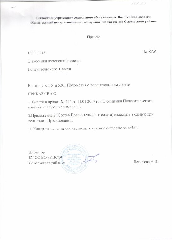 Попечительский совет создан при БУ СО ВО «Комплексном центре социального обслуживания населения Сокольского района», на основании ст. 17 Федерального закона «Об основах социального обслуживания населения в Российской Федерации»от 28.12.2013 N 442-ФЗ
