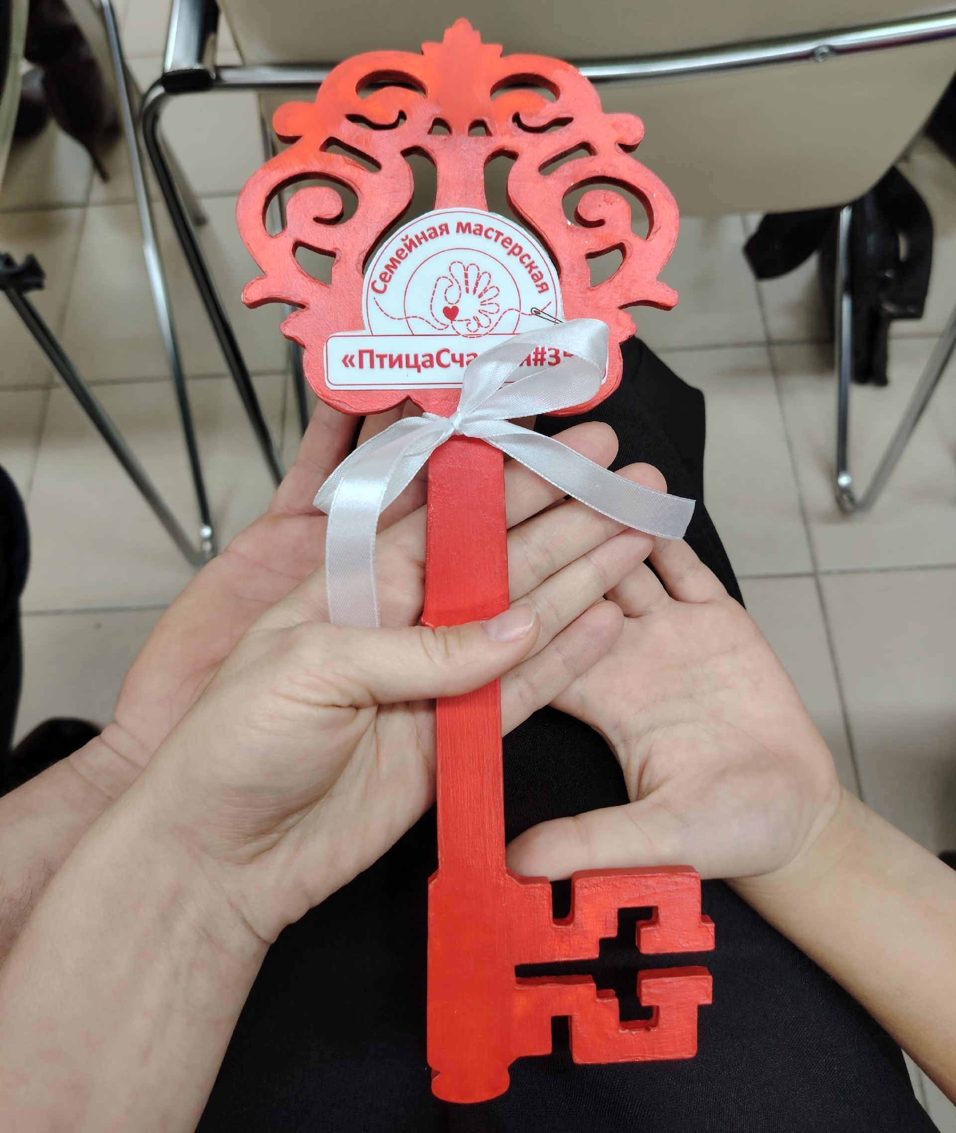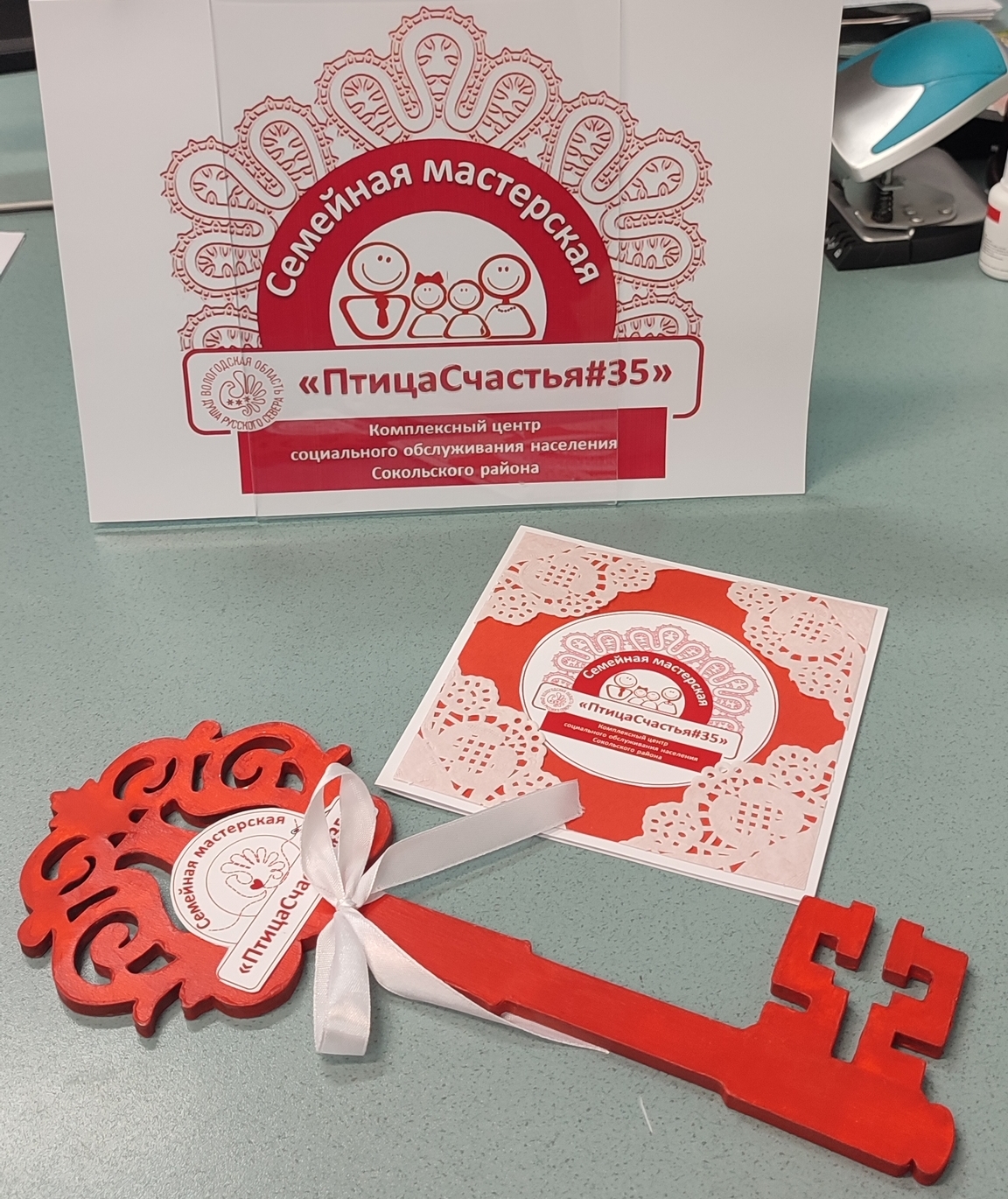 Символичный ключ от Семейной мастерской, как знак того, что здесь ждут все сокольские семьи, вручен многодетной семье Крыловых. Сам ключ изготовила семья Трухиных в своей мастерской, созданной на средства социального контракта.