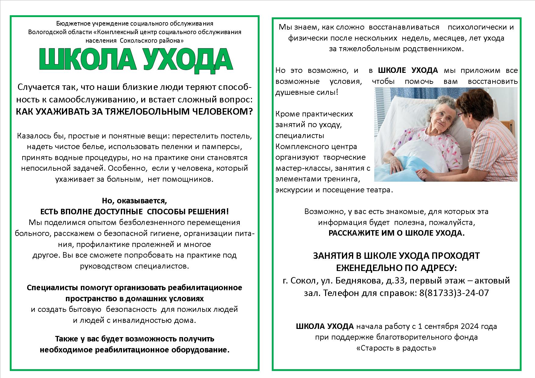 Занятия в ШКОЛЕ УХОДА будут проходить еженедельно по адресу: г. Сокол, ул. Беднякова, д.33, первый этаж – актовый зал. Телефон для справок: 8(81733)3-24-07.